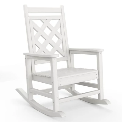 With its modern wood-textured finish, this versatile rocking chair complements any outdoor setting, from poolside lounging to cozy evenings around the fire pit. Elevate your outdoor living space with a chair that combines comfort, durability, and timeless style.