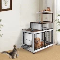 Dog Crate Furniture With Stairs, Wooden Dog Kennel Indoor With Double Doors, Cat Tree