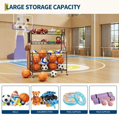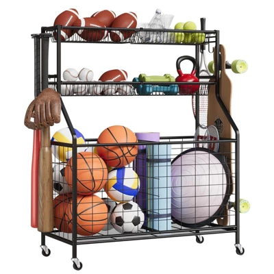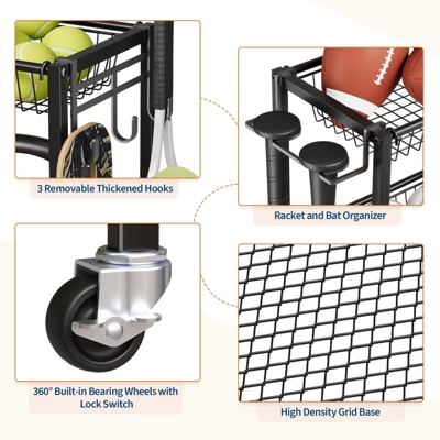 - Versatile Storage – 4 removable baskets + large ball bin + 3 hooks & bat organizer. Perfect for balls, rackets, bats, and gear.