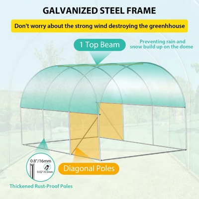Our walk – in tunnel greenhouse is a top – notch choice for gardening enthusiasts, offering a range of high – quality features. The durable 140G green PE grid fabric cover provides excellent light transmission and insulation, effectively regulating internal temperatures to encourage plant growth, especially during winter months, making it ideal for winter gardening. Its robust galvanized pipe frame (19×0.6) ensures outstanding stability and long – lasting durability, with the galvanized construction preventing rust for use in various outdoor environments. The specially designed widthened bottom enhances stability and wind resistance, protecting plants from external weather impacts like bright sunshine or snowstorms. For ventilation and access, it has six mesh windows and a convenient zipper roll door that can be fully opened, improving air circulation, keeping pests out, and providing easy access. Additionally, it’s easy to assemble with all necessary installation accessories included, such as white gloves, screws, a wrench, ground pegs, and guy ropes, requiring no professional skills and making it accessible to all.